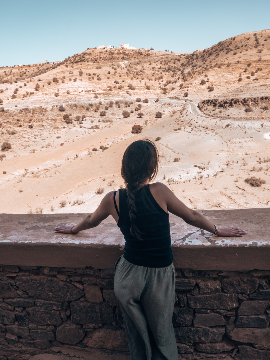 Nous y prenons une petite boisson sur la terrasse panoramique face au néant de l’Atlas.