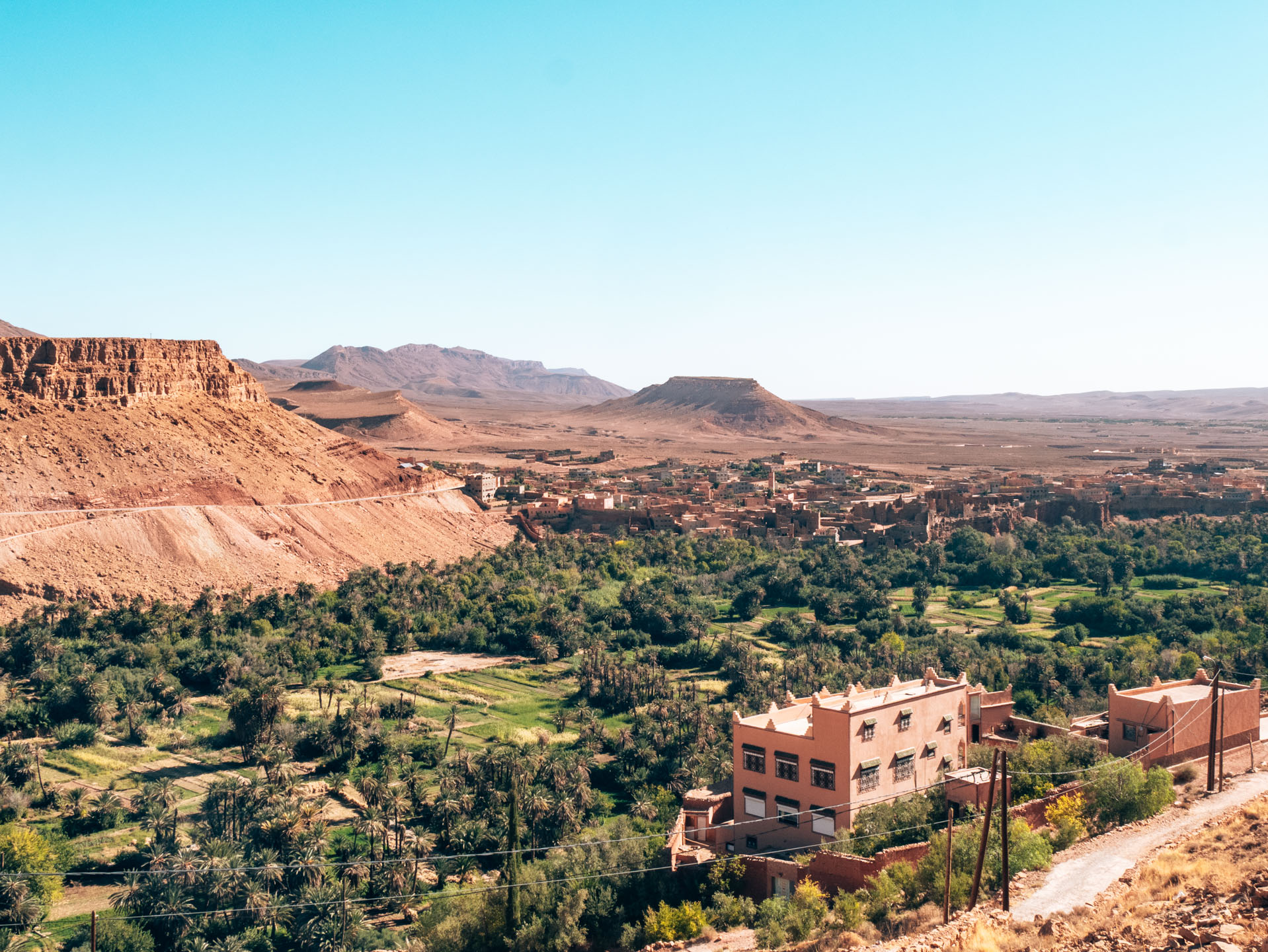 Et puis d’un coup d’un seul, au milieu de nul part, une ville ultra moderne se matérialise. Hôpital, institut de recherche et grands hôtels paraissent complètement incongrus. Tinghir est en perpétuelle expansion, d’immenses lotissements sont en construction et grignotent petit à petit les terres. Il faut dire que la vallée regorge d’eau, atout non négligeable pour la croissance urbaine.